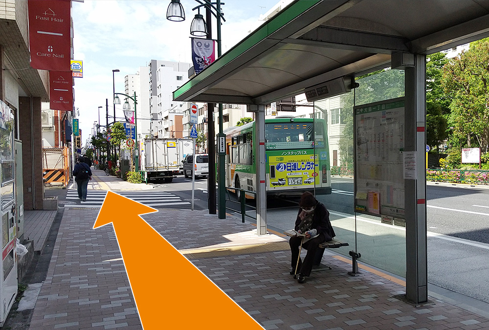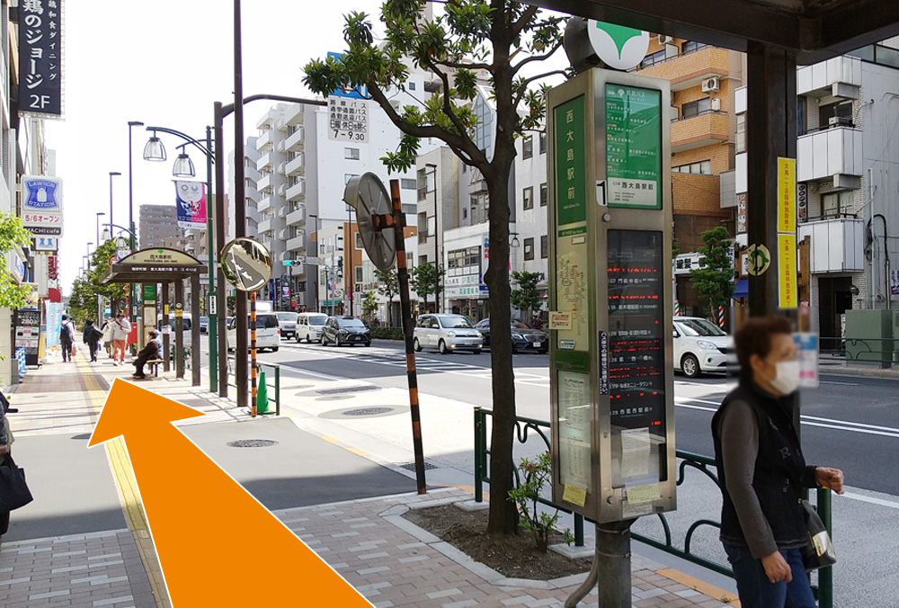 バスを降りましたらバス進行方向と同じ向きに進みます。(西大島駅に向かう方向です)