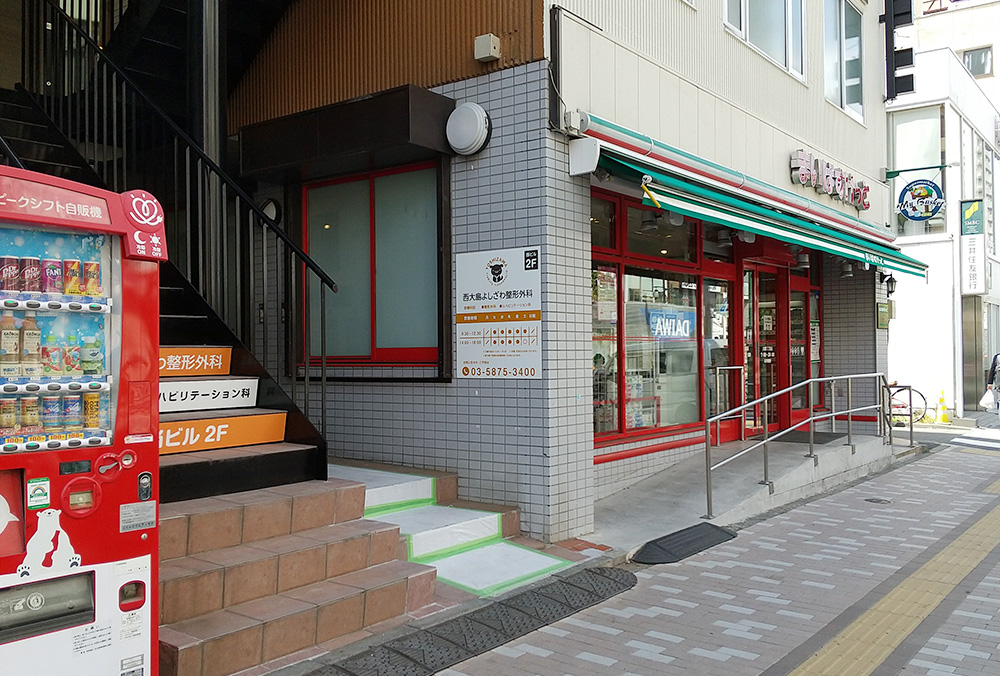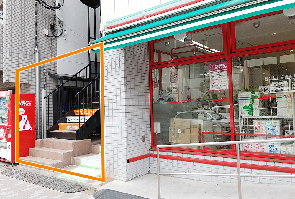 当クリニックは2階にございます。まいばすけっと正面左側に入り口がございますのでこちらから2階へとお越しください。